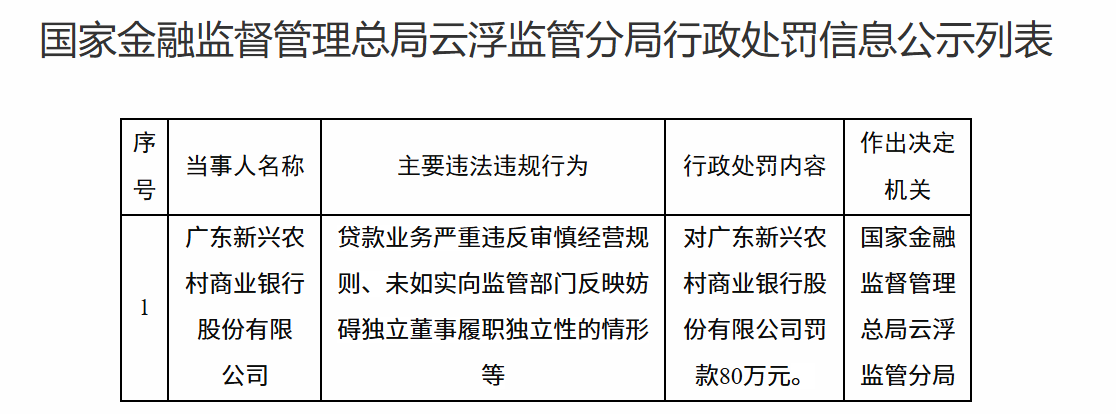 1月27日,国家金融监督管理总局云浮监管分局行政处罚信息公示列表显示,广东新兴农村商业银行股份有限公司因贷款业务严重违反审慎经营规则、未如实向监管部门反映妨碍独立董事履职独立性的情形等被罚款80万元。