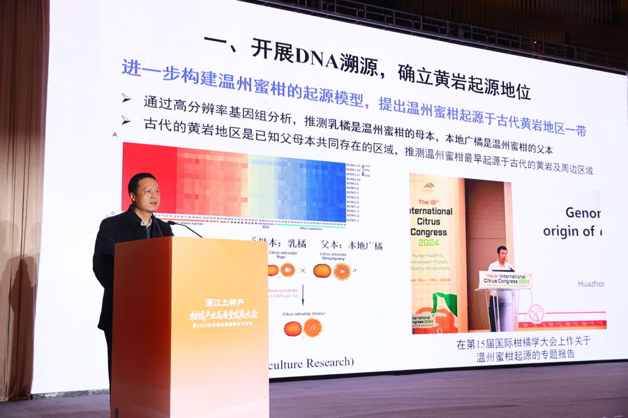 中国农业科学院曹芳芳副研究员发布重要农业文化遗产——浙江黄岩蜜橘筑墩栽培系统阶段性研究成果;四川陶然柑桔新品种研究有限公司总经理邱永刚、浙江省柑橘研究所所长黄振东、华中农业大学园艺林学学院副院长周继荣,分别发布与黄岩合作的新品种选育、科技成果及联合研发的新品种。