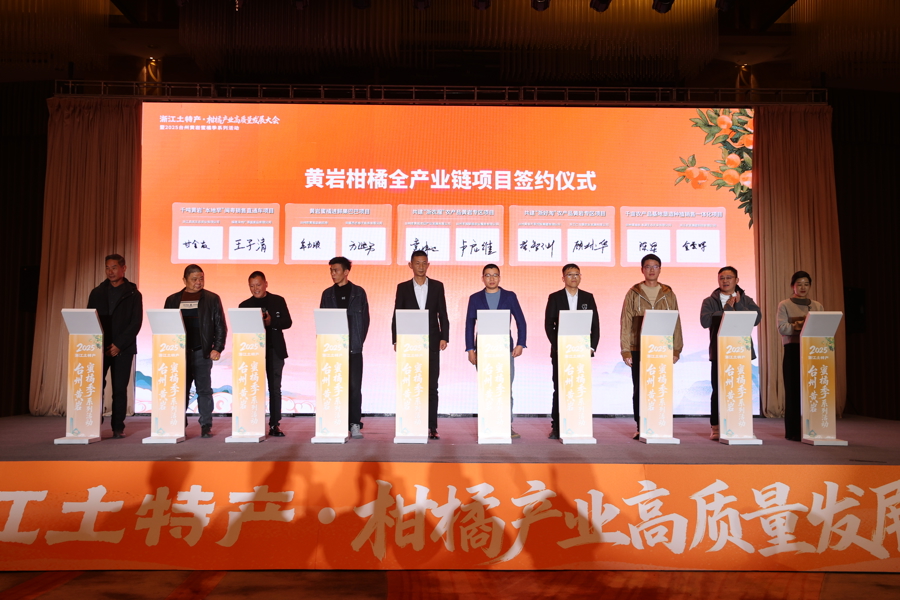 同时,蜜橘季品牌宣传系列活动发布,黄岩柑橘全产业链合作签约仪式签署,10项合作协议涉及品牌推广、销售、加工等领域,为黄岩蜜橘产业发展全面赋能。
