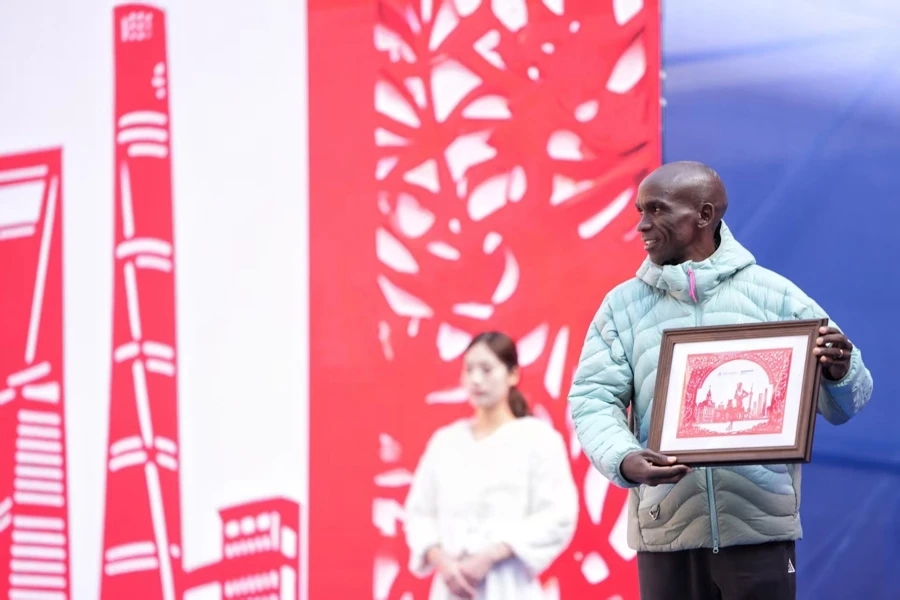 赛前发布会上,一场特别的礼物交换仪式见证了世界跑者与中国赛事的联动与融合。两届奥运会冠军、原世界纪录保持者、11座马拉松大满贯冠军获得者基普乔格带来了一份礼物。基普乔格在2018年就和上马结缘,当时他以鸣枪嘉宾的身份出现在赛道上,激励着每一位跑者。2023年,基普乔格也曾来到上海,当时他说:“我想激励下一代年轻人参与跑步,讨论跑步,传播跑步的理念。我想帮助中国成为奔跑的国家。”